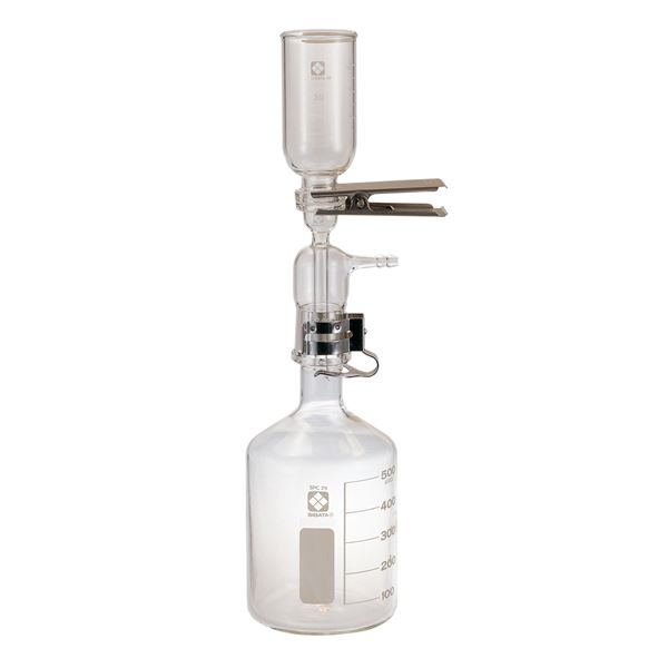 フィルターΦ25mm用のフィルターホルダーです。サポートスクリーンは取りはずしのできるSUS316製ですので、洗浄や交換が簡単にできます。専用クランプにより、フィルターベースとファンネルをきつく押さえ、溶液はフィルターのあるろ過面だけを通ります。ガラス部にほうけい酸ガラス-1を使用しています。減圧ろ過による一般分析に適していますが、特に注射液中の不溶性微粒子の分析や小容量の清澄ろ過に適しています。