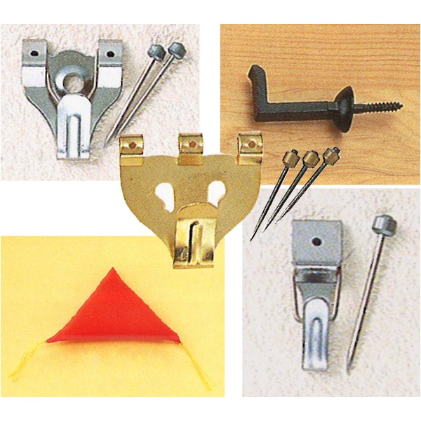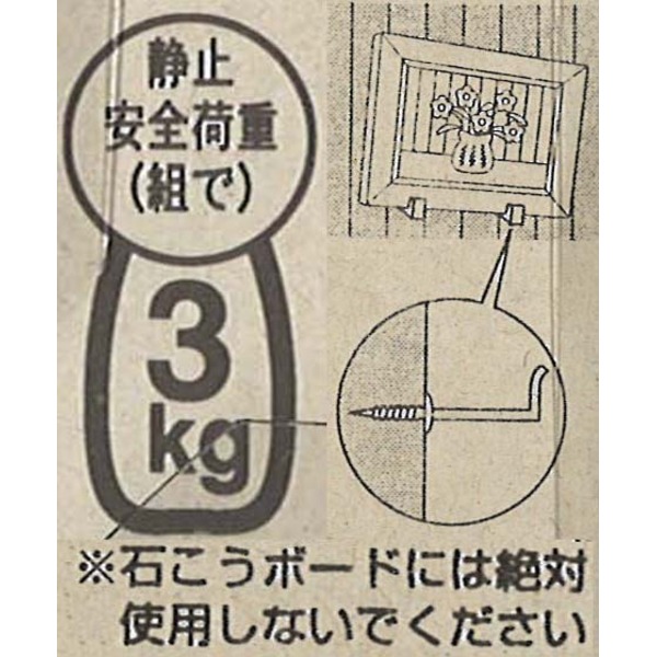 合板などの素材の薄い壁でネジのきかない場合は芯材の通っている部分(胴線)に取り付けてください。また、ねじ込む時に角度が悪かったり材質が固い場合には金具とネジの結合部が破損することがありますのでね必ずキリ等で下穴をあけてから壁に直角にねじ込んでください。額の種類、厚み、重量に応じて金具をお選び下さい。