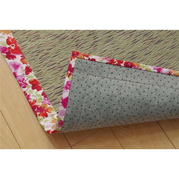 花柄のヘリを用いたい草ラグです。女性らしさ、春らしさを表現した商品です。裏面には滑りにくい加工をした不織布を使用しているため、フローリングにも最適です。い草には空気の自然浄化作用、湿度の調節作用などがあります。い草に青森ヒバ加工を施しています。(抗菌、防臭効果)