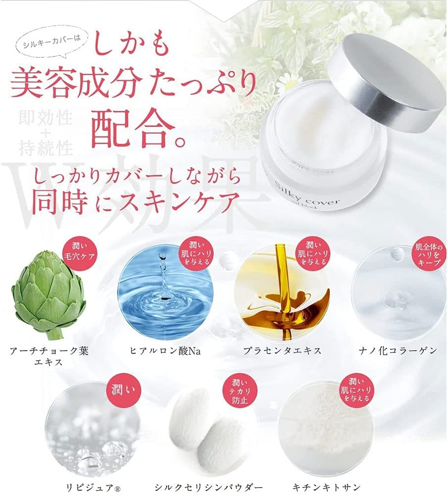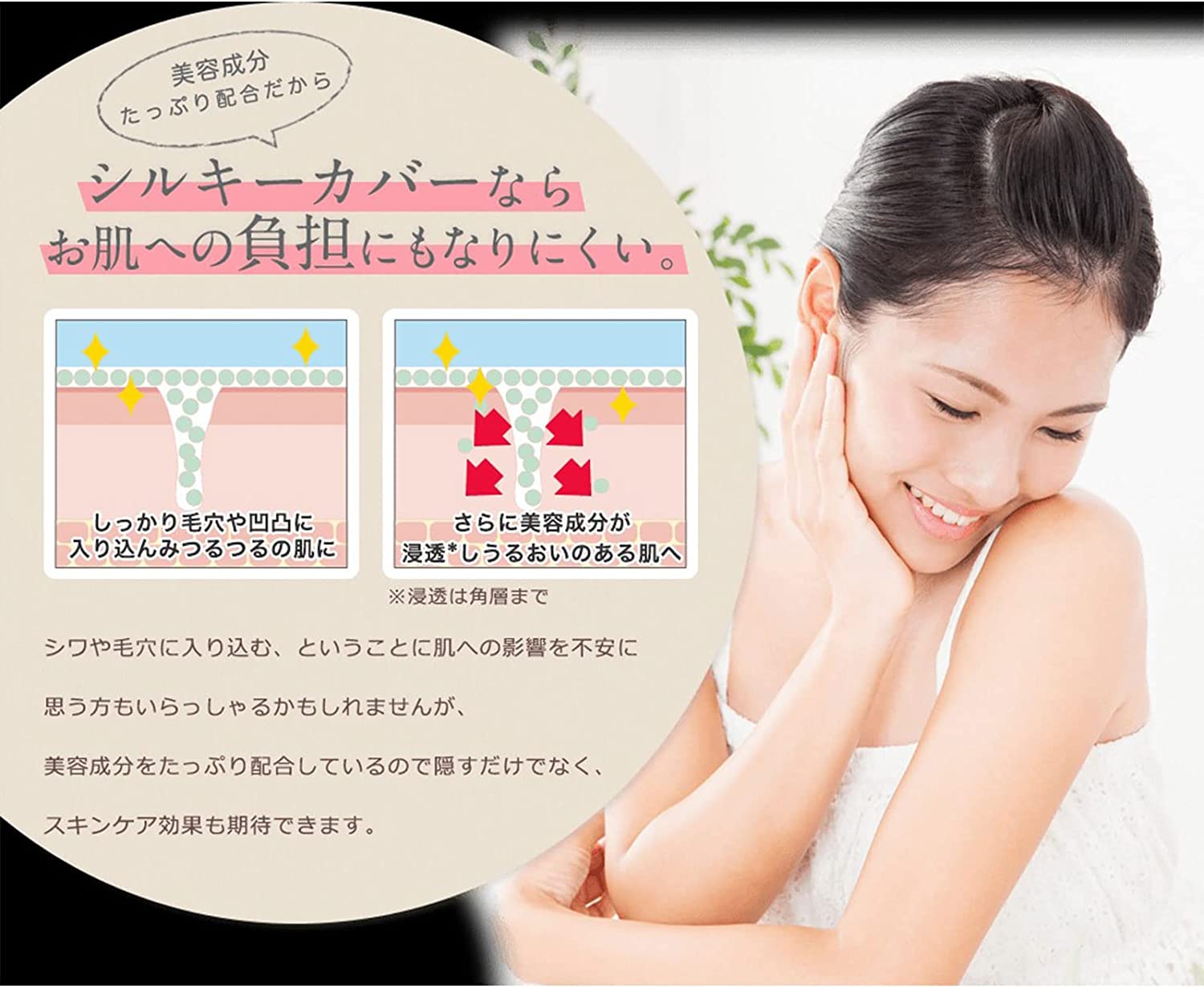 • キチンキトサンをはじめとした微粒子成分が肌の凹凸にピタッと密着するため、厚塗り感がなくカバーした部分はまるで本当の自分の肌のように馴染み、一枚ベールをかけたようなすっぴん風シルク肌が体感できます。