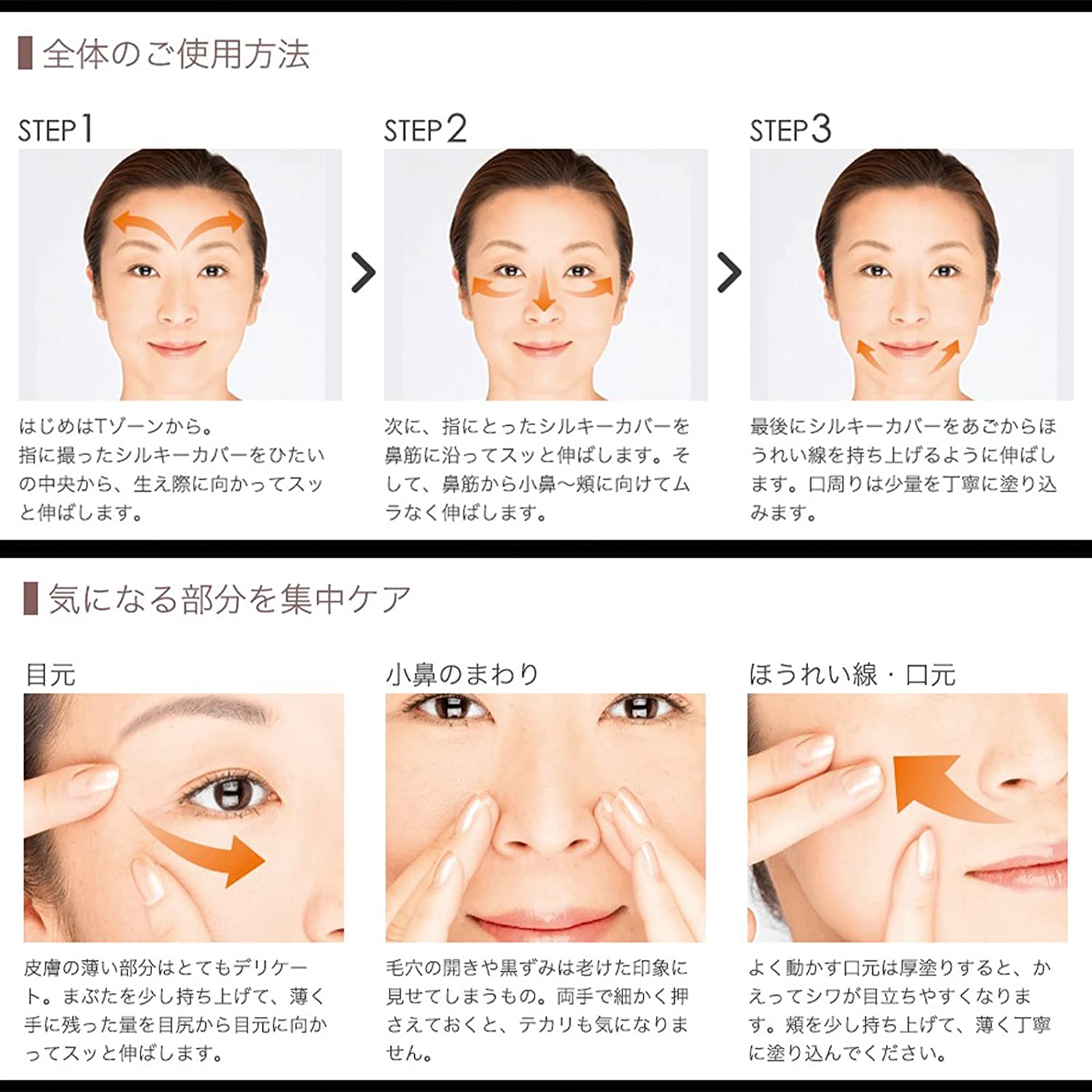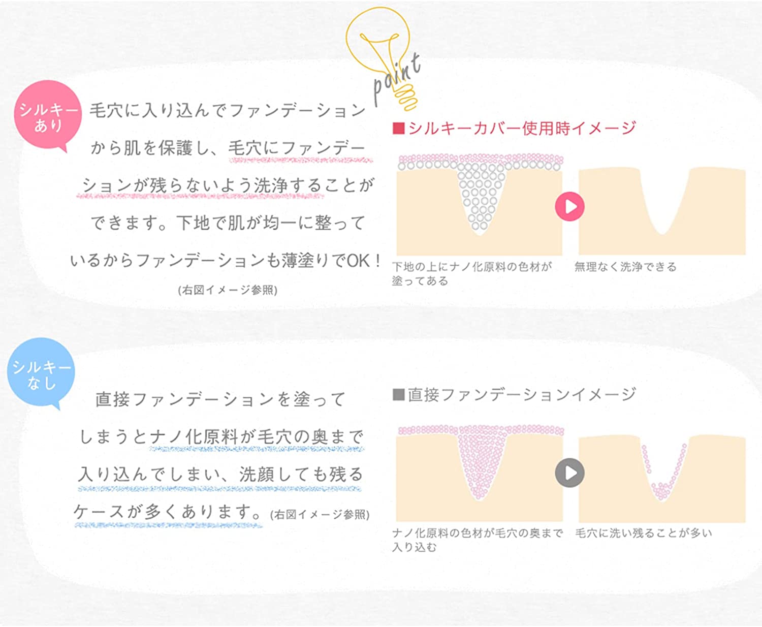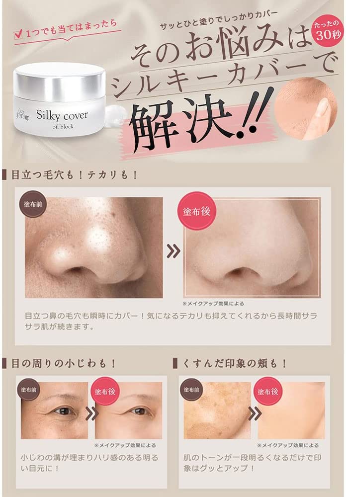 • シルキーカバーオイルブロックは、肌トラブルや年齢により開いた毛穴や小じわに入り込み、肌をフラットに整える化粧下地です。