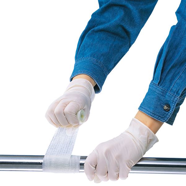 ※ 修理する前にパイプ、ホースの元栓を閉めて、管内の圧力を抜いてください。修理箇所の油、グリース、サビ、その他の汚れを拭き取ってください。テープがより強く接着するように、ヤスリやサンドペーパーで補修箇所の周りを傷つけてください。作業前には、必ず付属の手袋をしてください。