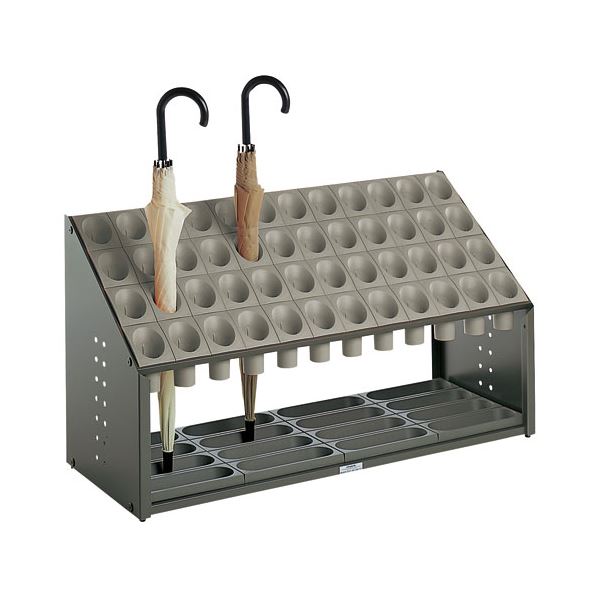筒状のシュートに傘を1本1本収納する傘立て48本用グレー。筒状のシュートに入れるので傘が真直ぐ立ち、からまずサッと取り出せます。水が直接触れる部分に樹脂製のトレイやシュートを使用し、サビを発生させにくいような設計です。受皿は外せるので、たまった水の処理や掃除が簡単。また、天板が斜めになっているため上に座ったり乗ったりできないようになっています。