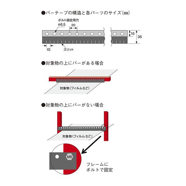 テープ上部に、粘着加工、およびボルトで固定可能な穴加工を施してあるので、製造ラインの左右に渡して、設置することができます。