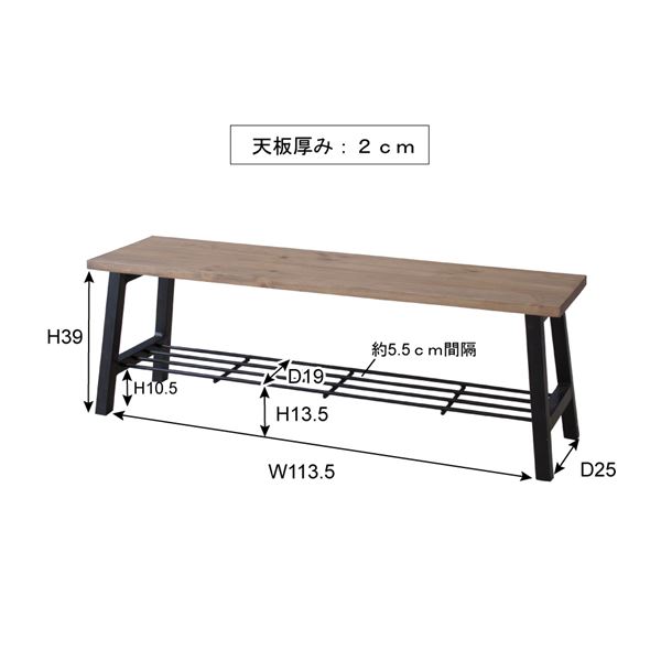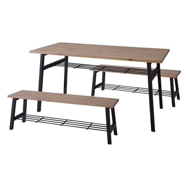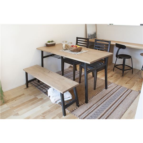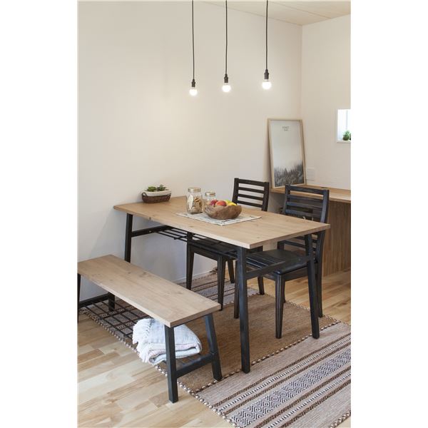 天然木とスチールを使用した、人気な異素材の組み合わせ。直線を活かしたシンプルなデザインはゆったりとしたスペースを作り、細身の脚は圧迫感のないスッキリとした印象をもたせます。テーブルだけでなくベンチにも棚を付け、コーヒーテーブルやテレビボードとしても活躍します。