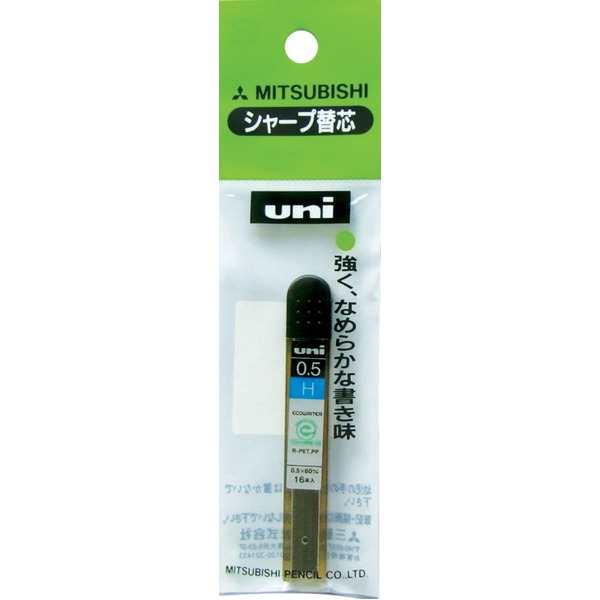 【特長】・再生樹脂ケース入りの、環境に優しいシャープ芯です。・芯幅は0.5mm、硬度はHになります。