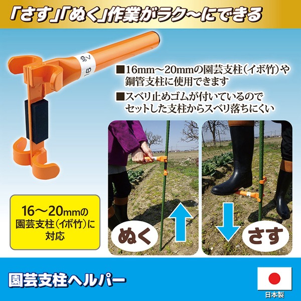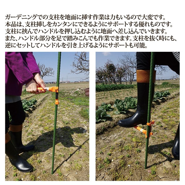 ガーデニングでの支柱を地面に挿す作業は力もいるので大変です。本品は、支柱挿しをカンタンにできるようにサポートする優れものです。支柱に挟んでハンドルを押し込むように地面へ差し込んでいきます。また、ハンドル部分を足で踏みこんでも作業できます。支柱を抜く時にも、逆にセットしてハンドルを引き上げるようにサポートも可能。