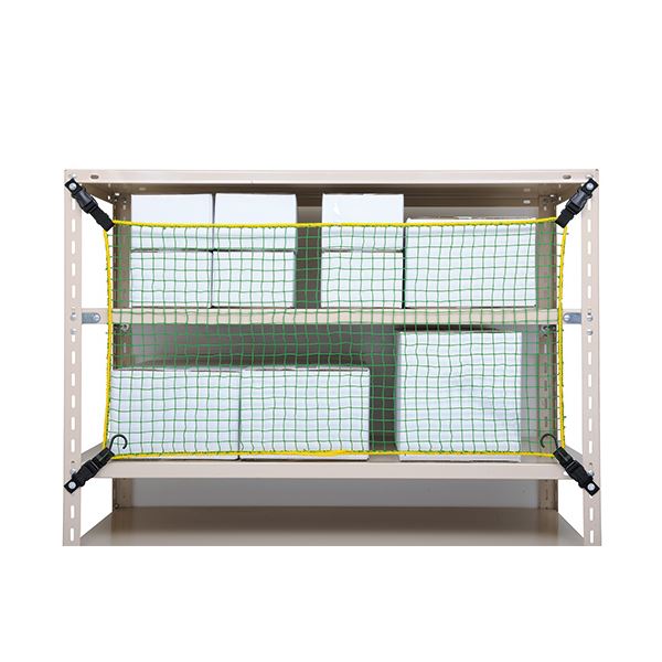 落下防止用棚ネット/対応棚幅1200mmタイプ。地震など災害対策に大切な収納物の落下を防止します。揺れによる落下を防止する災害対策用品です。ワンタッチで脱着ができるので、作業の負担になりません。作業中、ネットが邪魔にならないフック付き。備蓄用品の収納場所にも適しています。