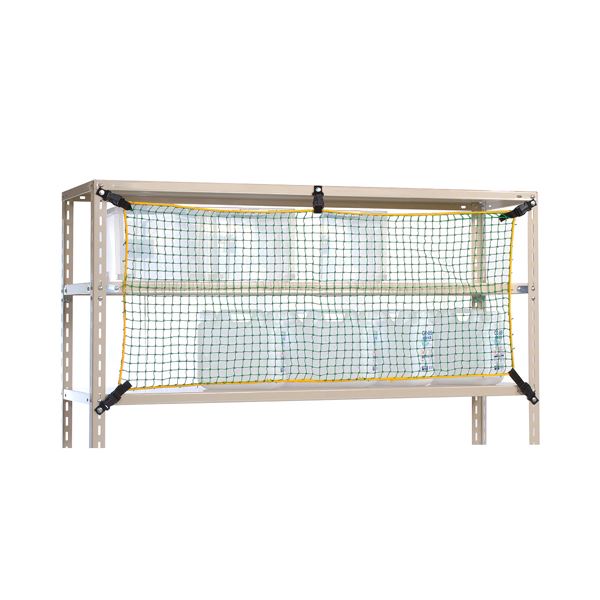 落下防止用棚ネット/対応棚幅1800mmタイプ。地震など災害対策に大切な収納物の落下を防止します。揺れによる落下を防止する災害対策用品です。ワンタッチで脱着ができるので、作業の負担になりません。作業中、ネットが邪魔にならないフック付き。備蓄用品の収納場所にも適しています。1800mm対応サイズにはセンター止めがあります。