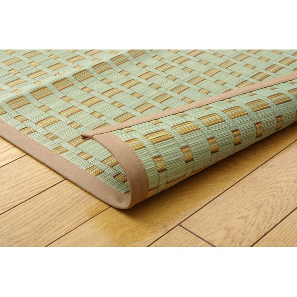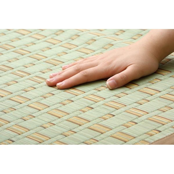 い草敷物の中でも高級品とされる「掛川織り」のカーペットです。掛川織は九州筑後地方の伝統的な織り方です。大きな目と小さな目に交互に織り込んだ美しく洗練されたモダンなデザインが人気です。また、厳選された良質の太く長いイ草を高密度に織り込んでいますので丈夫で耐久性があり、しかも素足に心地よいクッション性とボリューム感があります。い草には空気の自然浄化作用、湿度の調節作用などがあります。また汚れにくく、使用するうちに黄金色に変化し味が出ます。い草に青森ヒバ加工を施しています。(抗菌、防臭効果)
