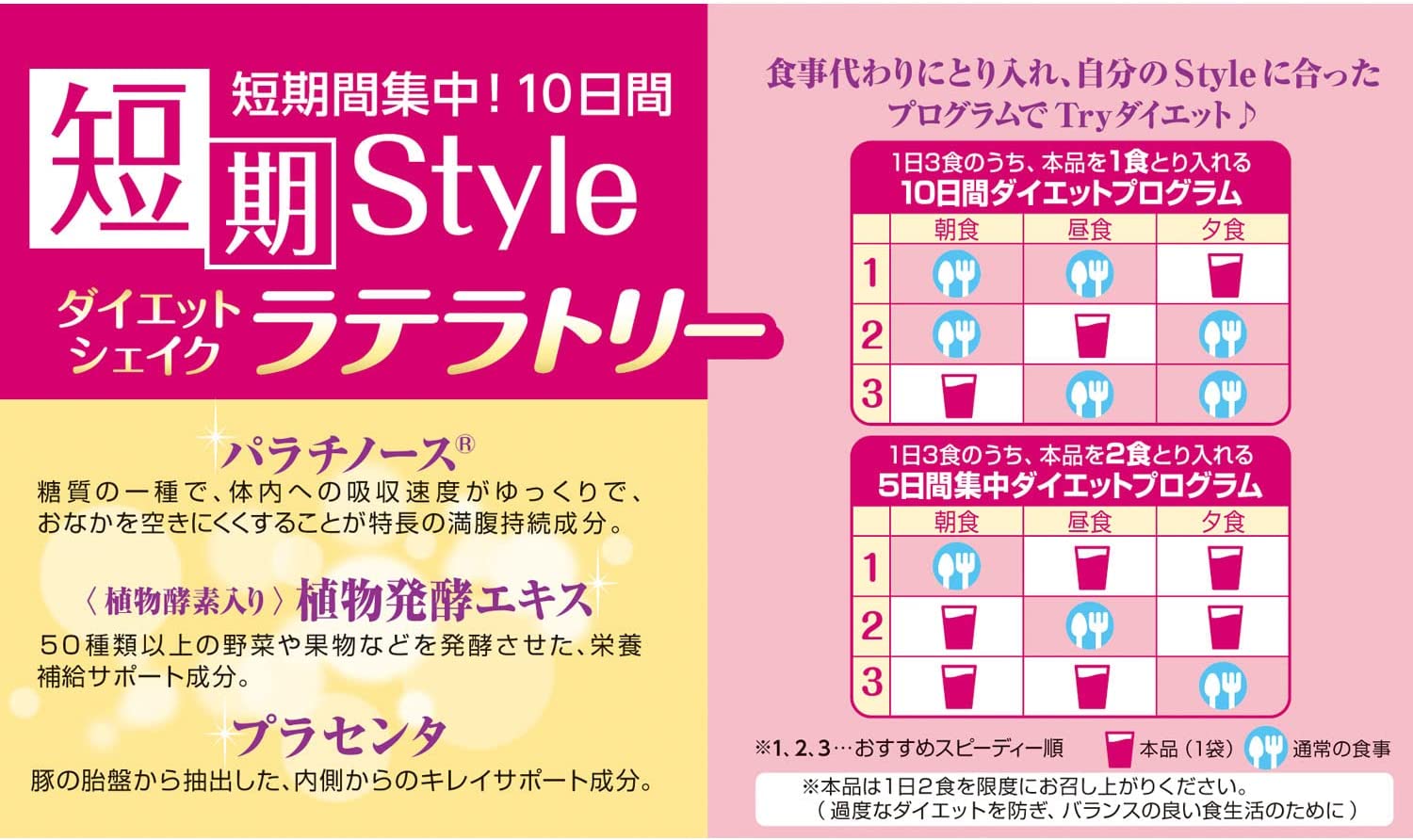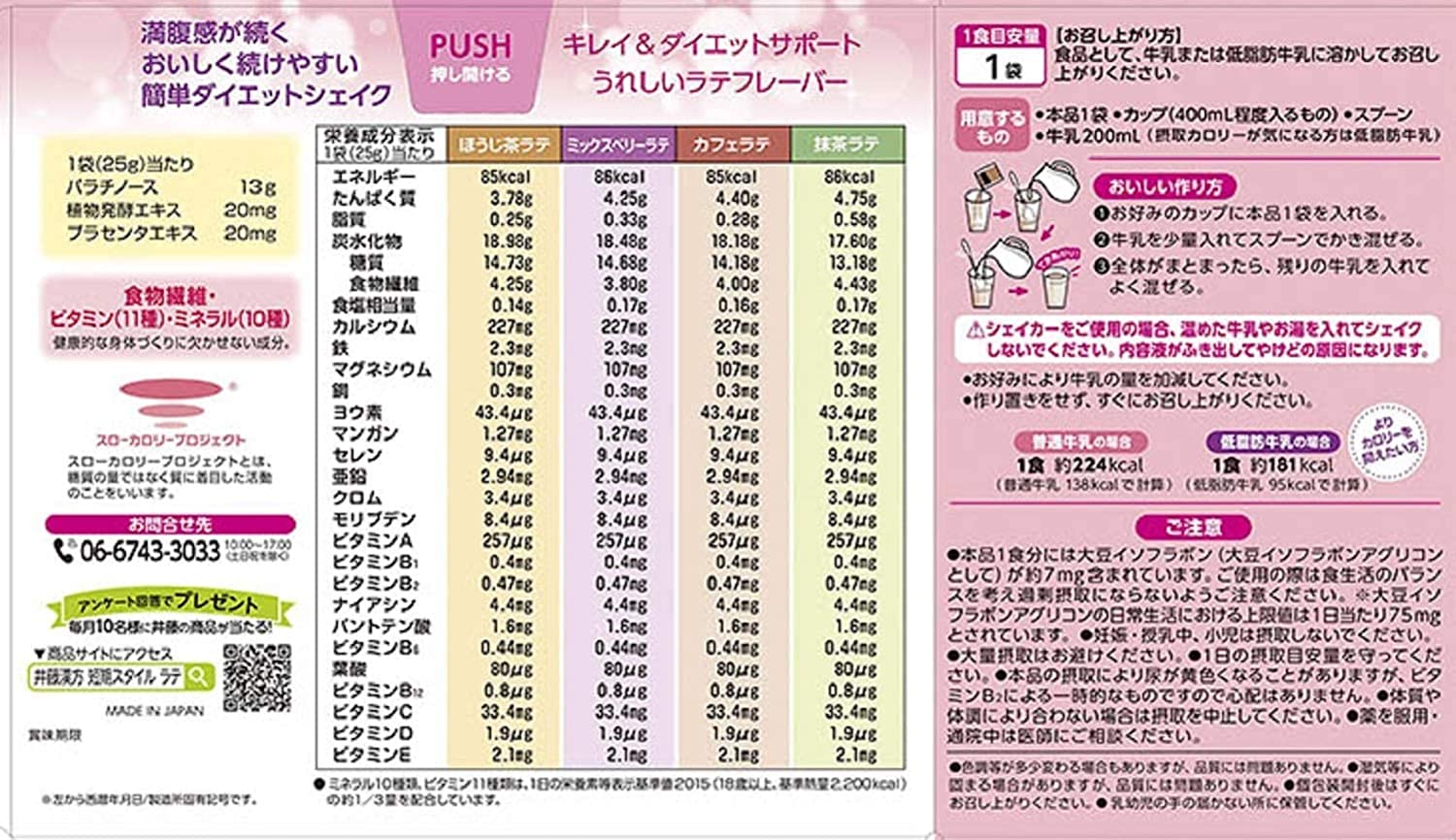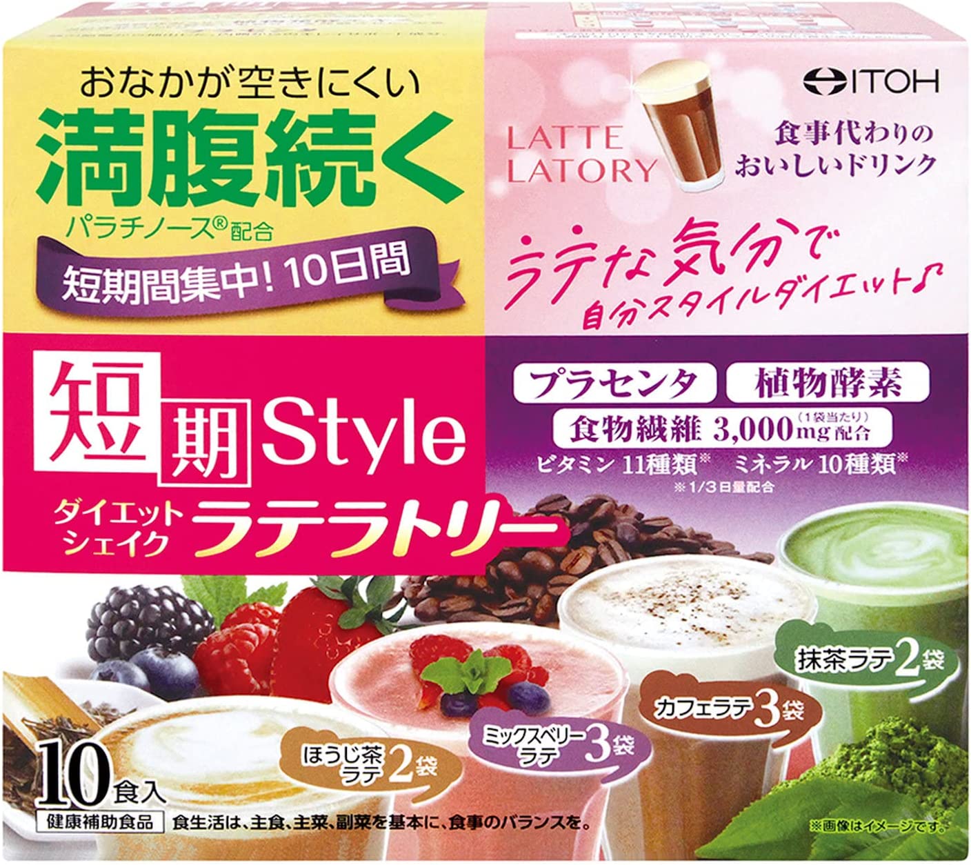 • 満腹感続く、食事代わりに 飲むダイエットシェイク 。 満腹サポート 成分 パラチノース 、 植物酵素 、 プラセンタ 、 食物繊維 、 ビタミン 、 ミネラル配合 で、キレイと健康をサポートします。女性に人気のラテフレーバー4種類(ほうじ茶ラテ、ミックスベリーラテ、カフェラテ、抹茶ラテ)をセレクト。