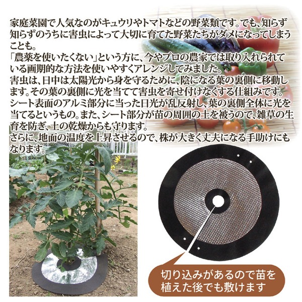 家庭菜園で人気なのがキュウリやトマトなどの野菜類です。でも、知らず知らずのうちに害虫によって大切に育てた野菜たちがダメになってしまうことも。「農薬を使いたくない」という方に、今やプロの農家では取り入れられている画期的な方法を使いやすくアレンジしてみました。害虫は、日中は太陽光から身を守るために、陰になる葉の裏側に移動します。その葉の裏側に光を当てて害虫を寄せ付けなくする仕組みです。シート表面のアルミ部分に当った日光が乱反射し、葉の裏側全体に光を当てるというもの。また、シート部分が苗の周囲の土を被うので、雑草の生育を防ぎ、土の乾燥からも守ります。さらに、地面の温度を上昇させるので、株が大きく丈夫になる手助けにもなります。