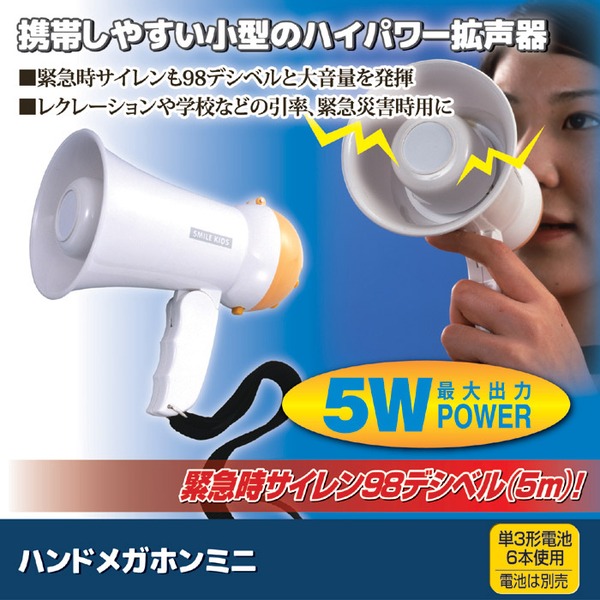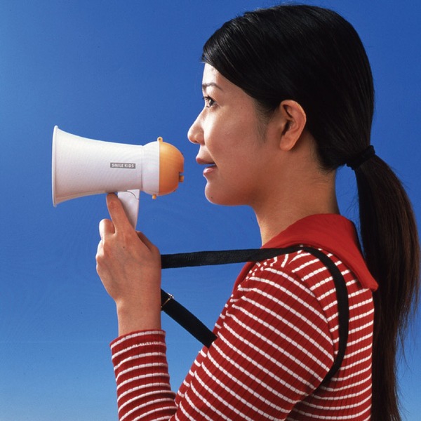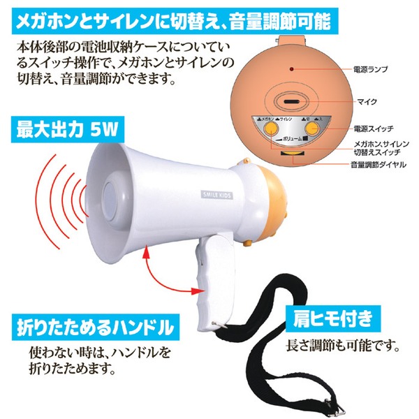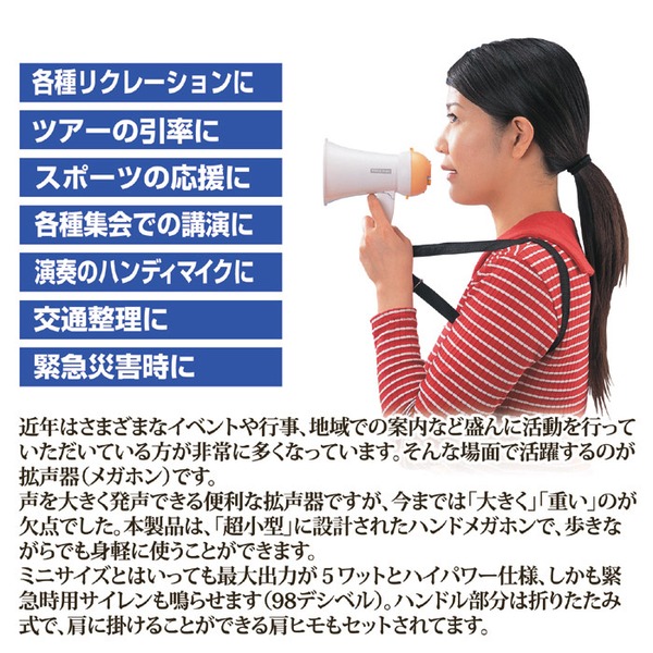 近年はさまざまなイベントや行事、地域での案内など盛んに活動を行っていただいている方が非常に多くなっています。そんな場面で活躍するのが拡声器(メガホン)です。声を大きく発声できる便利な拡声器ですが、今までは「大きく」「重い」のが欠点でした。本製品は、「超小型」に設計されたハンドメガホンで、歩きながらでも身軽に使うことができます。ミニサイズとはいっても最大出力が5ワットとハイパワー仕様、しかも緊急時用サイレンも鳴らせます(98デシベル)。ハンドル部分は折りたたみ式で、肩に掛けることができる肩ヒモもセットされてます。