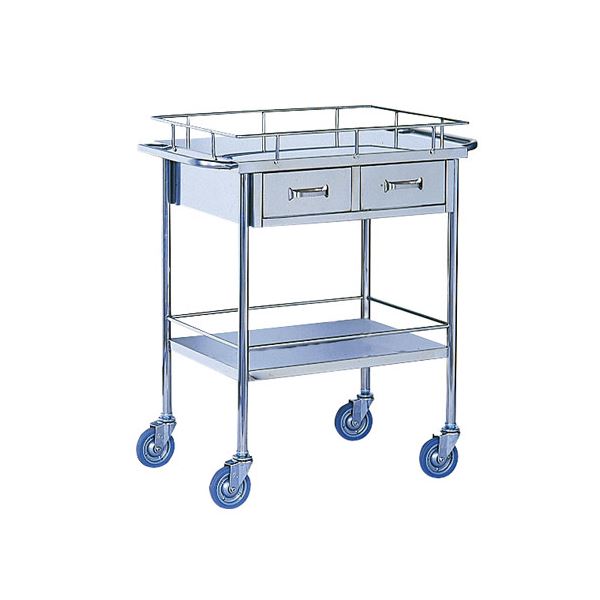 医療施設向けの、耐久性に優れたステンレス製の回診車/引出し付き。引出しには細かい医療器具も収納できます(引出に仕切板はありません)。天板と下棚には、医療器具などの落下を防止する柵付き。大きめのキャスターと両側のハンドルで移動も楽に行えます。