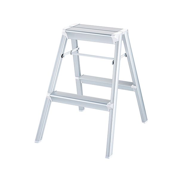 デザイン性と実用性を兼ね備えたアルミ製の踏台「スキットステップ」。シルバー2段タイプ。天場面下のレバーを持ち上げるだけの、ワンタッチで折りたたみができるので、手挟みの心配がありません。折りたたみ時に自立します。メーカー3年補償付き。