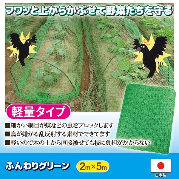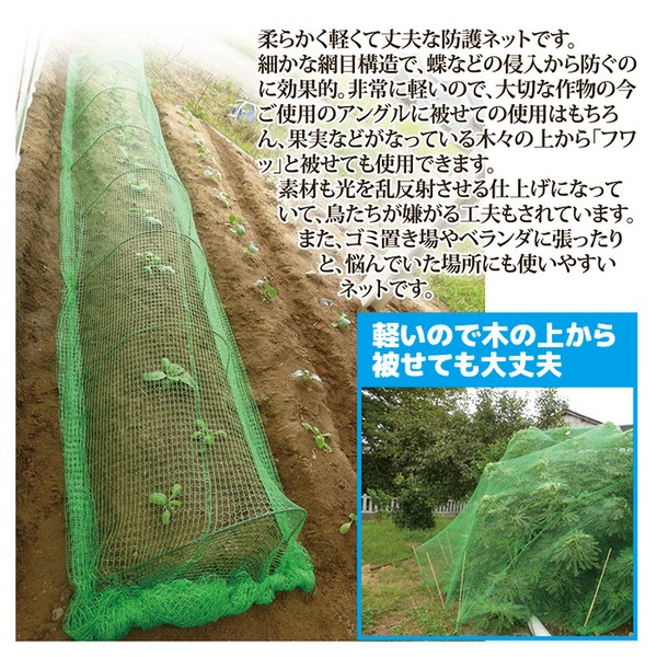 柔らかく軽くて丈夫な防護ネットです。細かな網目構造で、蝶などの侵入から防ぐのに効果的。非常に軽いので、大切な作物の今ご使用のアングルに被せての使用はもちろん、果実などがなっている木々の上から「フワッ」と被せても使用できます。素材も光を乱反射させる仕上げになっていて、鳥たちが嫌がる工夫もされています。また、ゴミ置き場やベランダに張ったりと、悩んでいた場所にも使いやすいネットです。