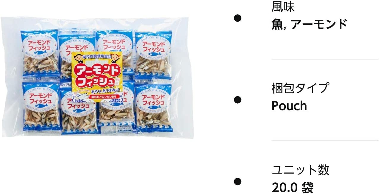 - 名称:魚介乾製品 、ナッツ 原材料名:アーモンド(アメリカ産)、片口いわし(国内産)、砂糖、麦芽糖、ごま 内容量:6gx20袋 賞味期限:約5ヶ月 保存方法:直射日光を避け開封後はお早めにお召し上がりください。 栄養成分表示(100gあたり):エネルギー462kcal たんぱく質30.2g 脂質19.9g 炭水化物40.5g 食塩相当量0.9g カルシウム900mg(西日本薬業株式会社 食品検査部調べ)