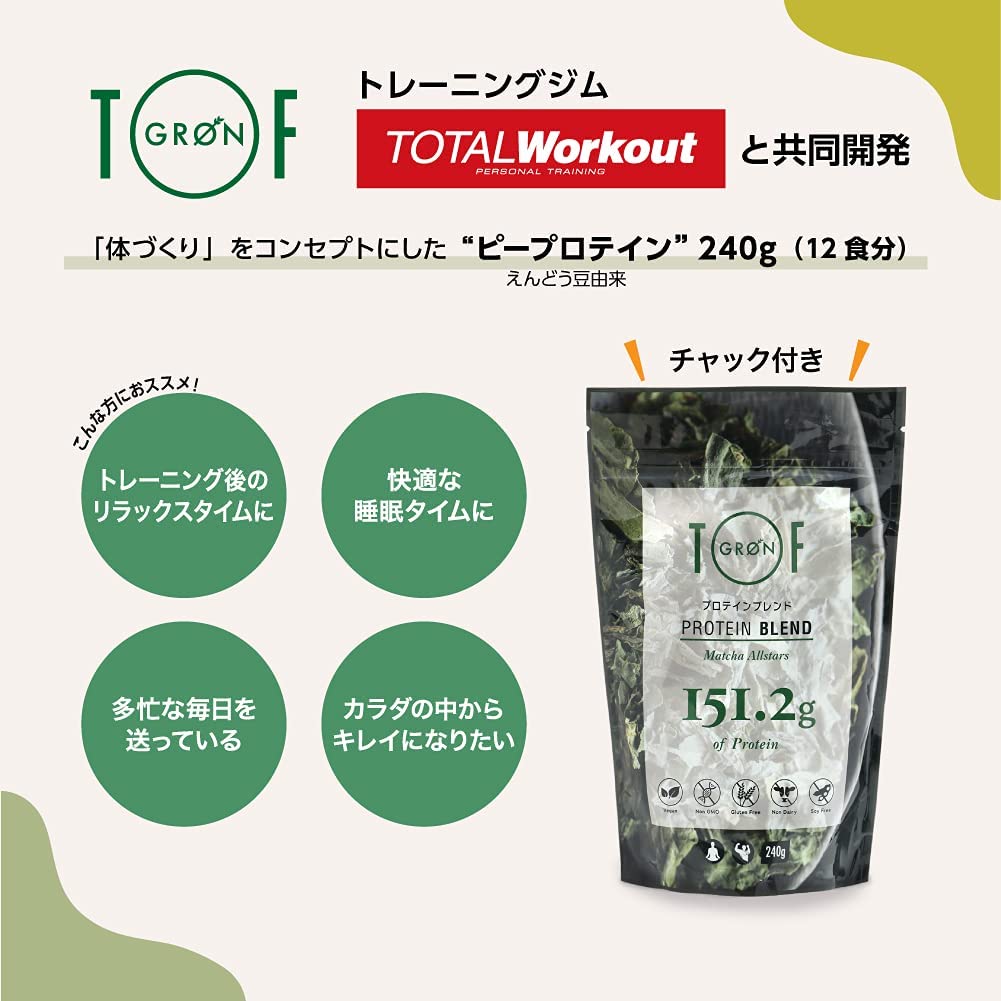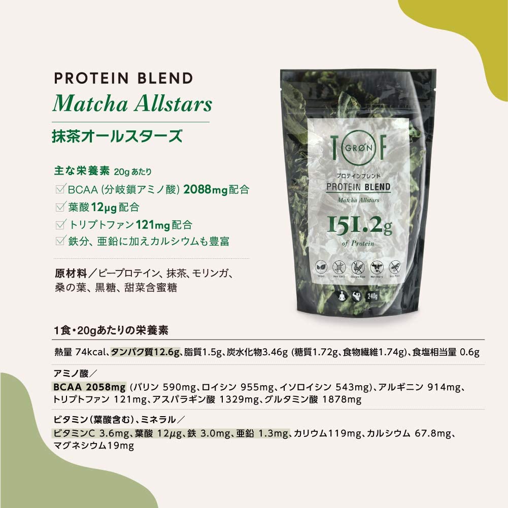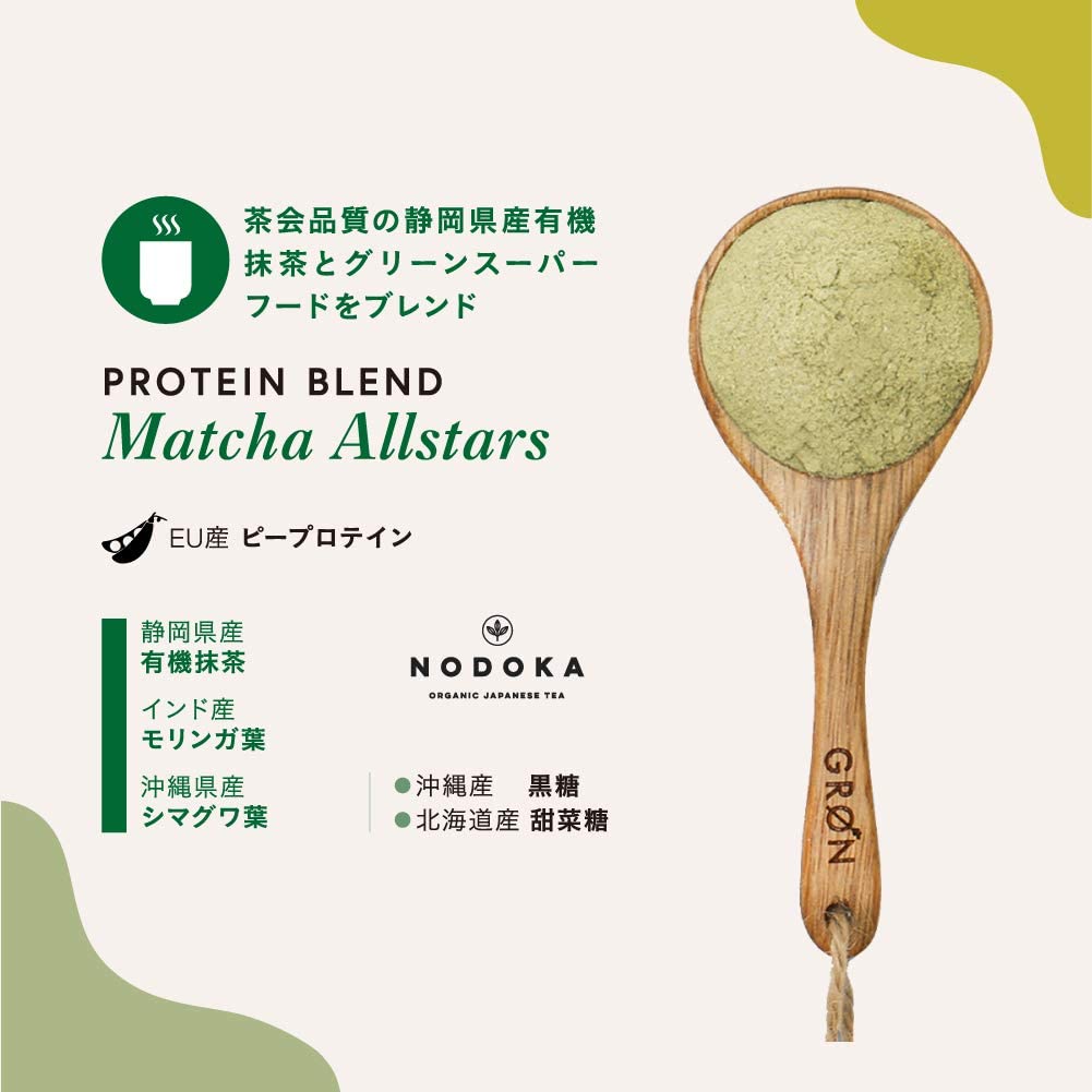 GRON (グロン) ピープロテイン スーパーフード配合 国産 無添加 ビーガン対応 グルテンフリー (抹茶オールスターズ, 240g)