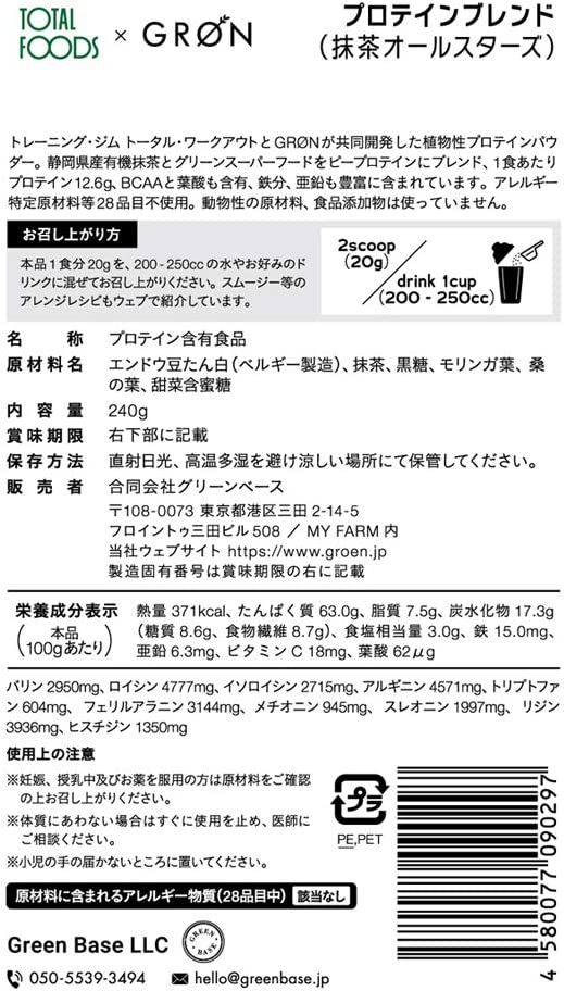 GRON (グロン) ピープロテイン スーパーフード配合 国産 無添加 ビーガン対応 グルテンフリー (抹茶オールスターズ, 240g)個